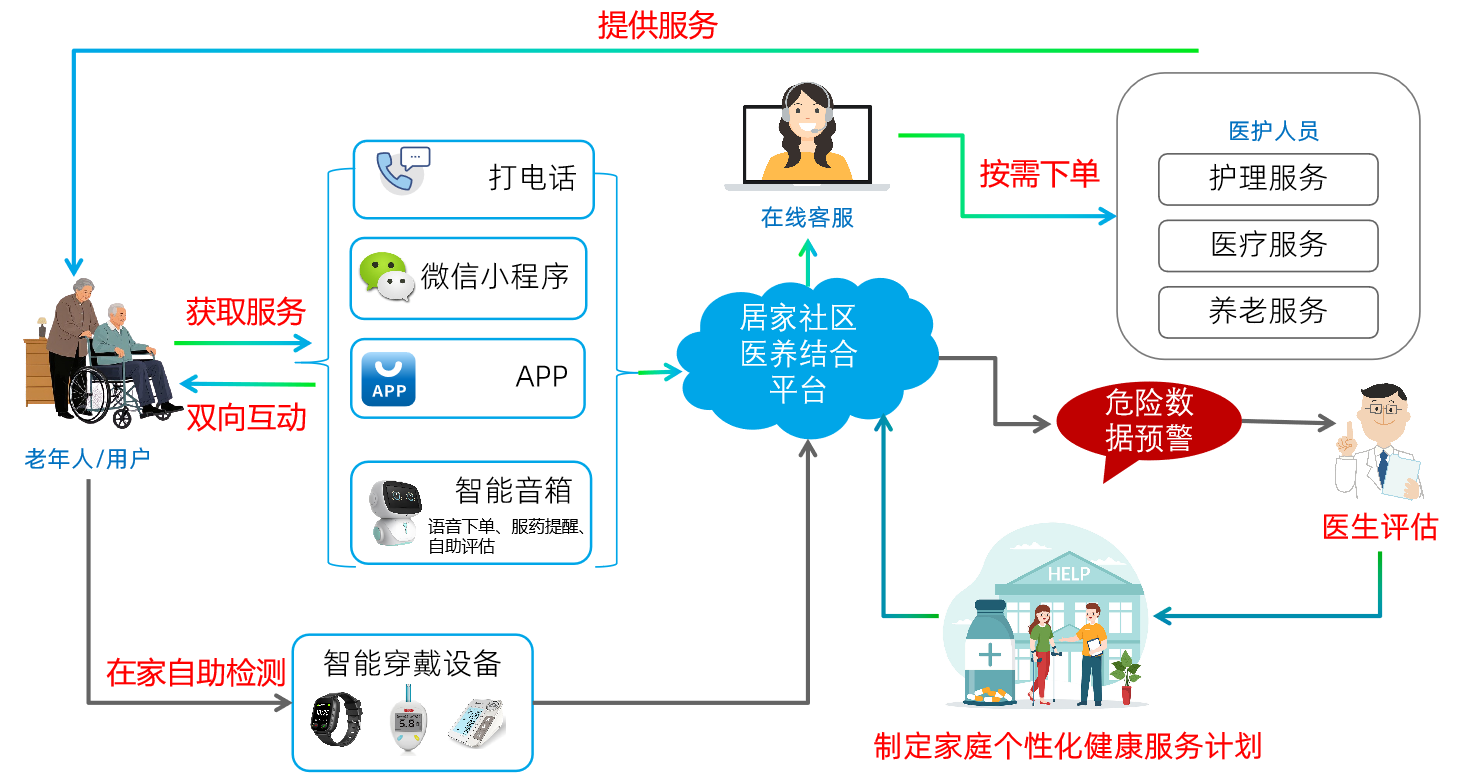 喜悦粤智慧健康管理平台是在深刻理解国家政策和养老服务体系特点的基础上,运用各种先进的信息技术(物联网、互联网、移动互联网技术、智能呼叫、云技术、GPS定位技术等),创建 “系统+服务+老人+终端”的智慧养老服务模式,并且涵盖了机构养老、居家养老、社区日间照料等多种养老形式。通过跨终端的数据互联及同步,连通各部门及角色,形成一个完整的智慧管理闭环,实现老人与子女、服务机构、医护人员的信息交互,对老人的身体状态,安全情况和日常活动进行有效监控,及时满足老人在生活、健康、安全、娱乐等各方面的需求。